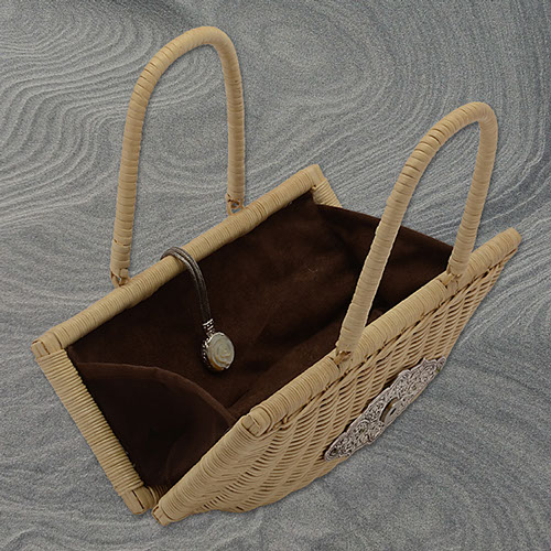 hand woven rattan basket purse synthetic suede lined gems stone and carved MOP