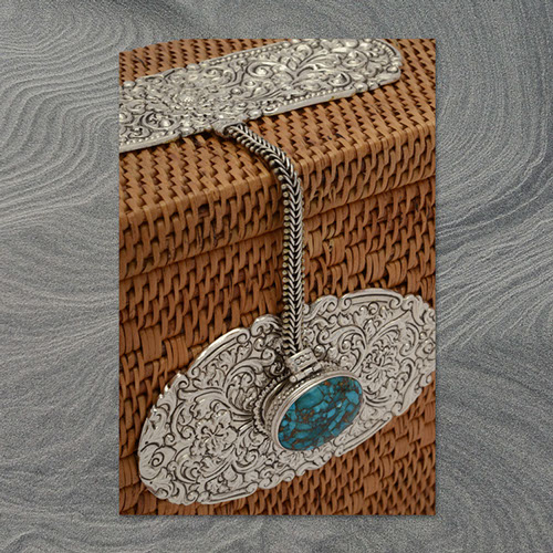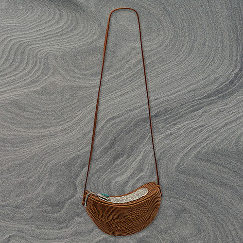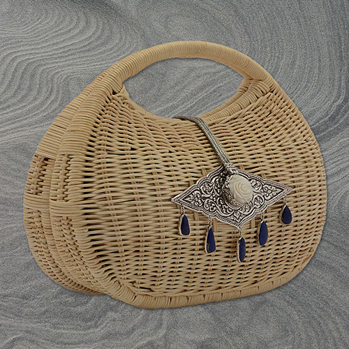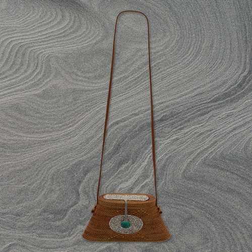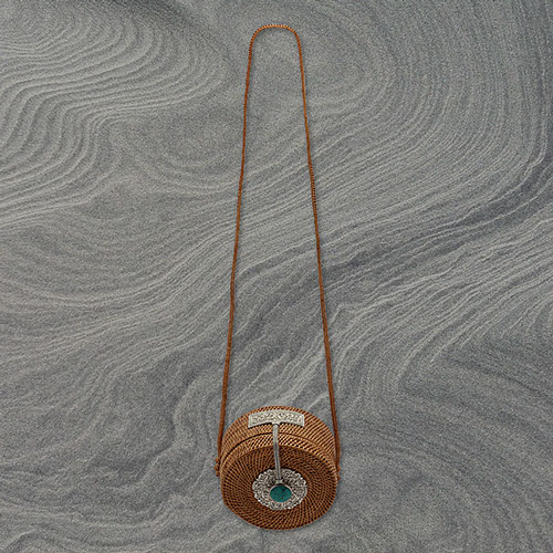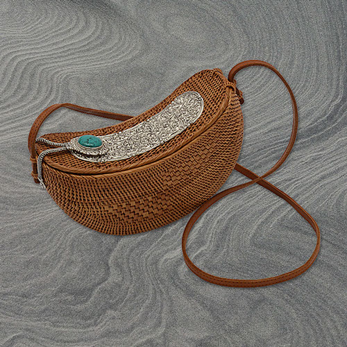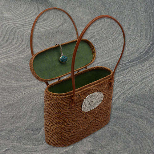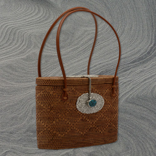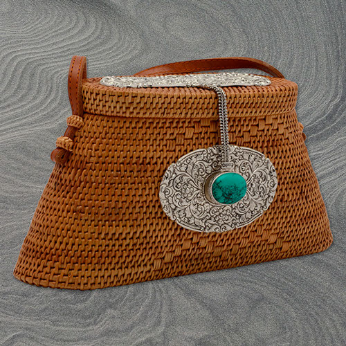 hand woven rattan basket purse cotton lined turquoise stone sand carved sterling silver