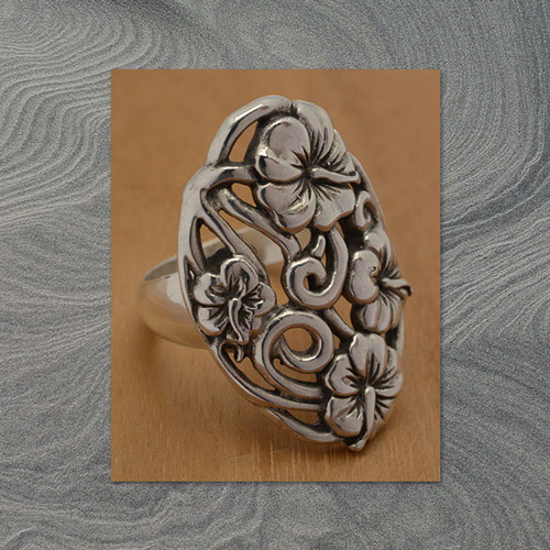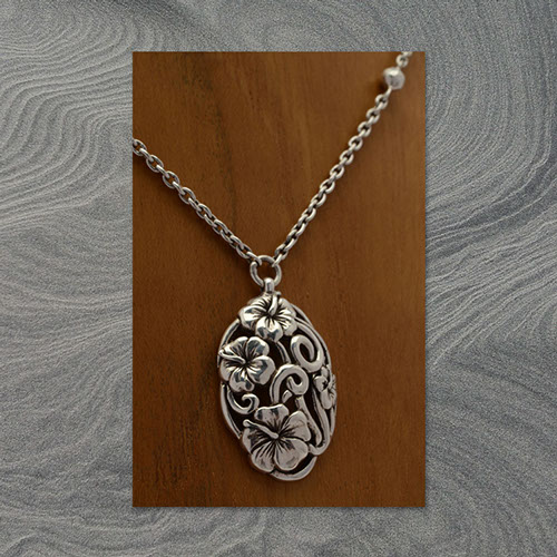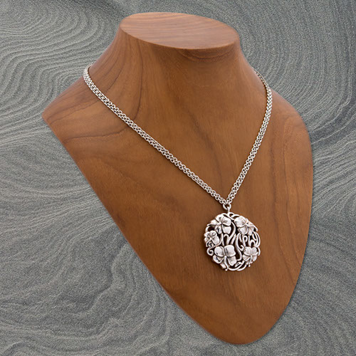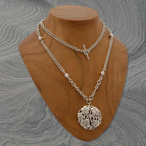 39 mm large round carved flower pendant with 16" double chain necklace sterling silver