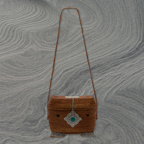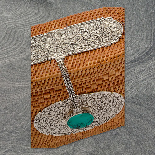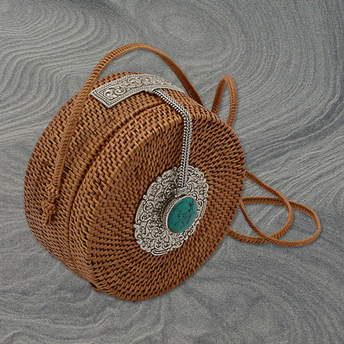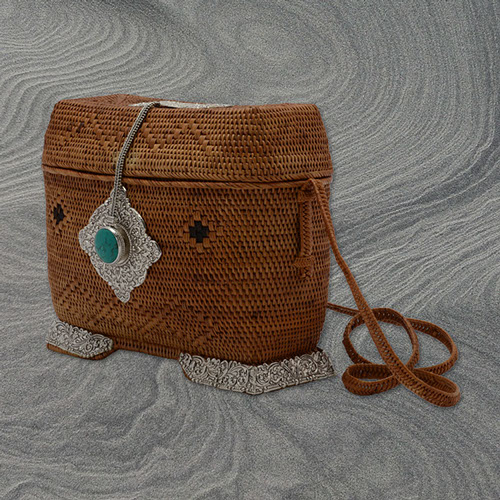 hand woven rattan basket purse cotton lined turquoise stone sand carved sterling silver